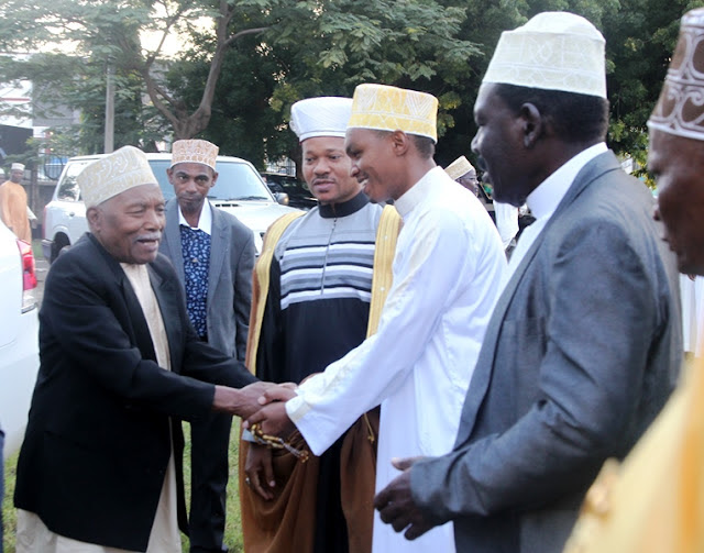 Waziri Mkuu Mstaafu Dkt Salim Ahmed Salim akiongozwa na Sheikh wa Mkoa wa Dar es Salaam, Al Had Mussa Salum pamoja na Mkuu wa Wilaya ya Kinondoni,Mhe.Salum Hapi kushiriki kwenye swala ya sikukuu ya